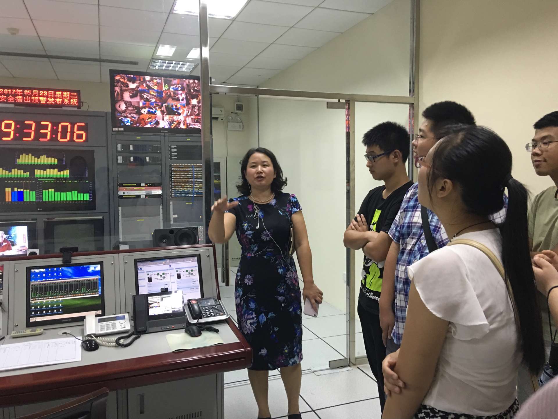 实践教学中,在海南广播电视总台办公室王玲主任带领下,同学们先后参观了民生广播、音乐广播、新闻广播、交通广播、国际旅游岛之声等广播电台直播现场和调试中心,以及电视台播控大厅和《直播海南》等电视直播现场。王主任精彩的讲解、一系列精密专业的设备、高度专注敬业的主播和工作人员给同学们留下深刻的印象,使同学们深受教育和启发。