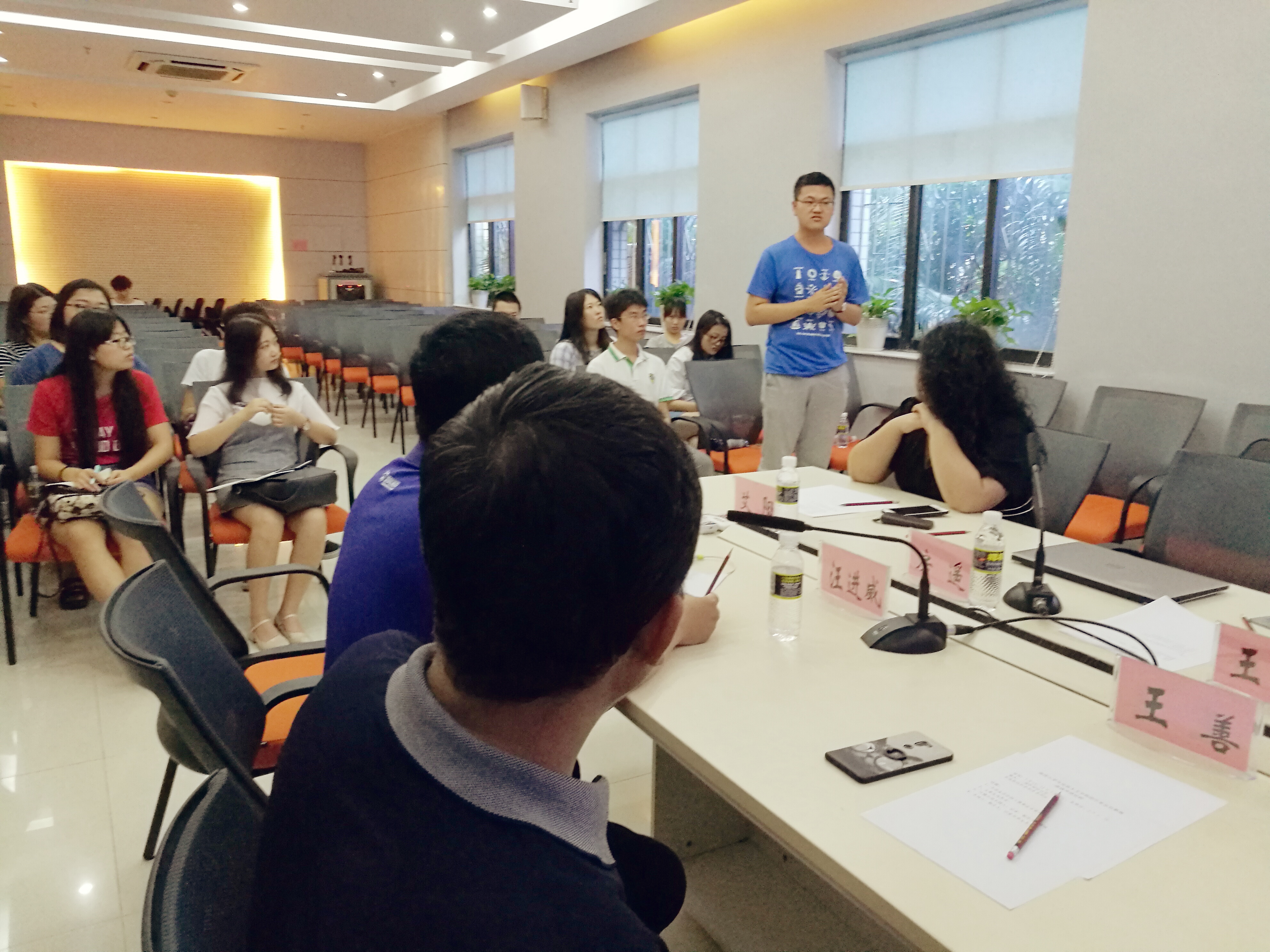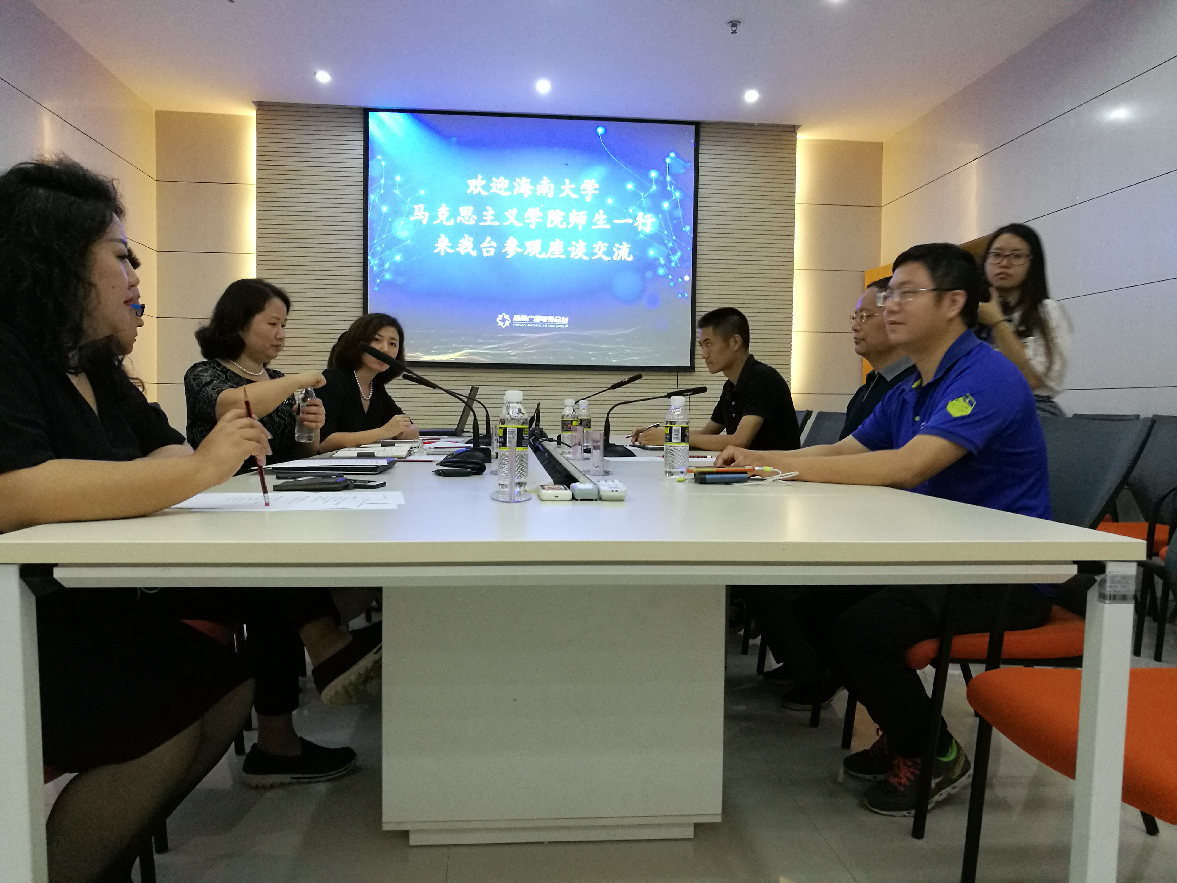 在海南广播电视总台会议室,观看了海南省电视台宣传片。互动交流环节围绕“互联网和新媒体时代如何更好进行舆论和价值观引导?”“如何选取新闻题材?”“新媒体与传统媒体的关系与融合?”等问题,同学们与王玲主任、著名主持人房遥、艾阳、叶微、乐宁、大超、新闻广播评论员靳畅栋、记者谢虹妃、制片人汪进威等进行了深入交流。他们精彩的分享、绝佳的口才、敏捷的思维使同学们受益匪浅。同时,他们对提问同学良好的专业素质和深入思考给予了充分肯定。