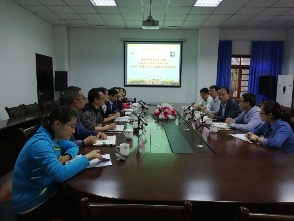 交流期间,受到四川师范大学402永利集团官网入口党委书记李北东、副院长王曦和四川农业大学402永利集团官网入口党委书记杨世义、院长赵晓霞的热情接待。在详细了解四川省高校形势与政策课程研究会的建设状况、发展前景、运行机制和未来设想,以及四川省形势与政策教师职业能力提升教学竞赛的有关情况之后,双方还就新时代《形势与政策》课程建设与改革、思想政治教育专业建设、思政课实践基地等问题展开详细深入的交流。交流最后,双方还就未来搭建两省高校之间的形势与政策教育教学资料共享、专家资源共享等实质性问题,达成合作的意向和意见。