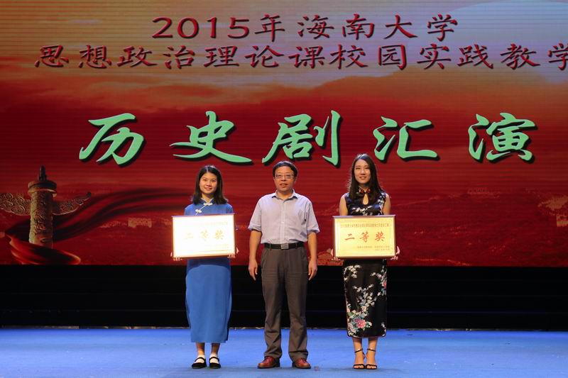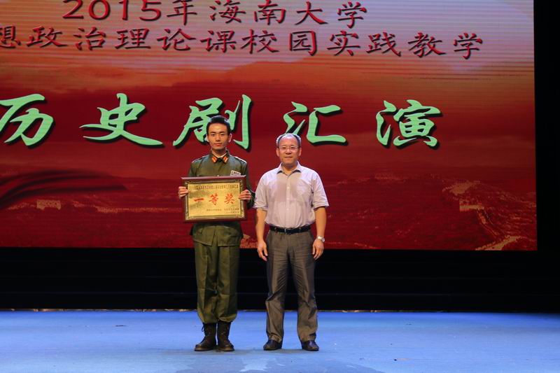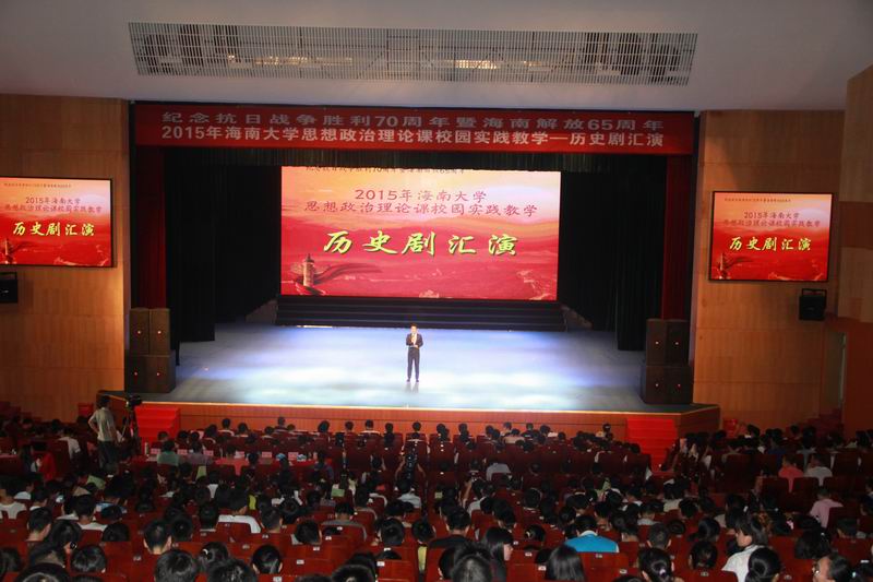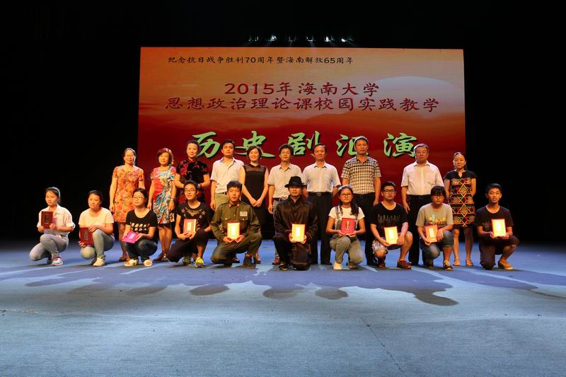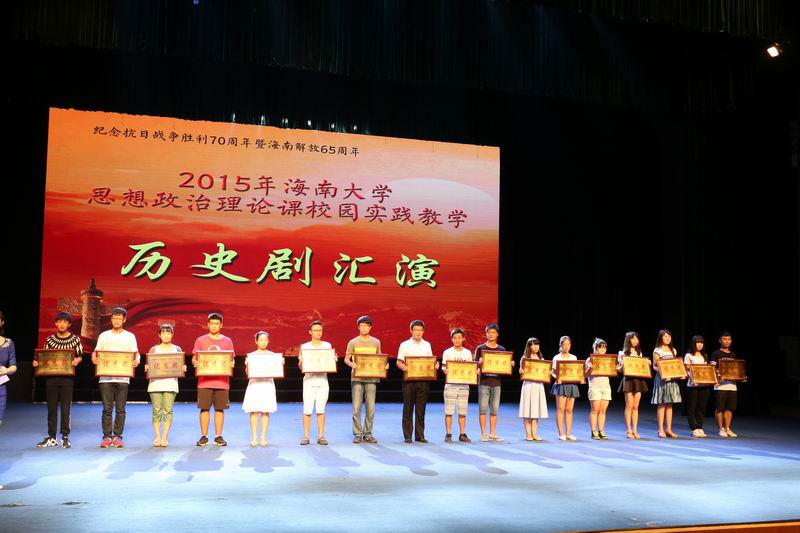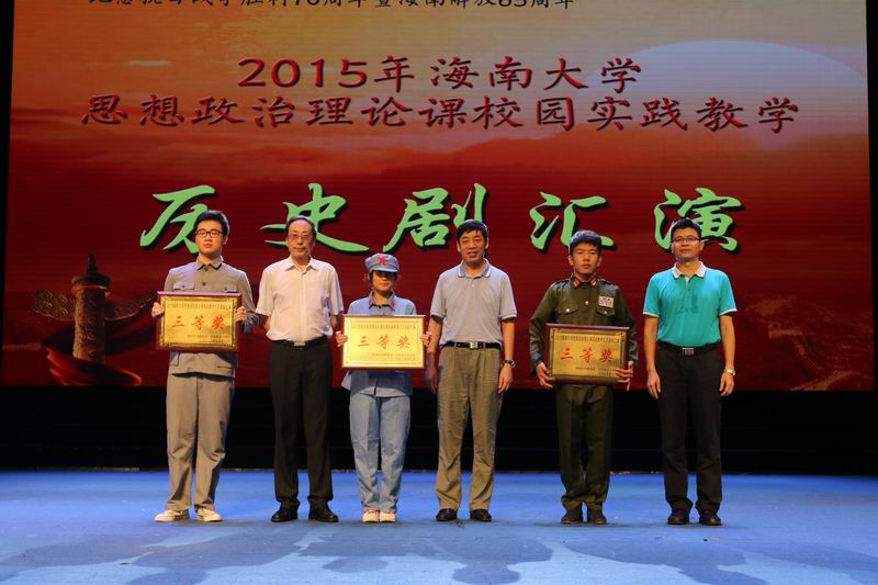 6月2日下午,由我校402永利集团官网入口主办,以纪念抗日战争胜利70周年暨海南解放65周年为主题的思想政治理论课校园实践活动——历史剧汇演在思源学堂举行。海南省委宣传部副部长郭志民,海南省委宣传部理论处处长温龙、海南省教育厅思政处处长文强,我校副校长王崇敏出席活动,来自全省18所高校思想政治理论课教学部门负责人及骨干教师60余人参与了现场观摩。 历史剧表演活动在《中国近现代史纲要》课堂上已经开展了3个月,此次参加汇演的6个剧目是从2014级不同专业的8000多名大学生自编、自导、自演的354个剧目中精选而出的。剧目主题鲜明,选材合理,内容积极向上,意义深刻。同学们表演形象逼真,动作到位,神态自然大方。演出过程中剧情衔接良好,整体效果佳,观众不时爆发阵阵掌声。 汇演结束后, 海南省委宣传部副部长郭志民和402永利集团官网入口副校长王崇敏分别为获一、二等的同学颁奖,海南省委宣传部理论处长温龙、海南省教育厅思政处处长文强和我校教务处处长欧阳克毅共同为获三等奖的同学颁奖,欧阳克毅对汇演进行了精彩的专家点评。 此次活动吸引了多家媒体的高度关注,新华网、中新网、海南日报均对此事进行了报道。兄弟院校观摩教师对此项活动寄予了高度的评价。学校党委领导对活动的开展给予关心和指导,校党委办公室、宣传部、教务处、艺术学院、团委、艺术团、网教中心等部门给予了大力的支持与配合。 学校教务处处长欧阳克毅、校党委宣传部副部长谭勇、402永利集团官网入口领导班子全体成员和部分学院分管教学副院长参加了活动。 据悉,402永利集团官网入口思想政治理论课教学团队经过多年理论研究与实践探索,成功构建了“一主三辅”实践教学模式,2014年,该项目入选教育部思想政治理论课教学方法改革择优推广计划。目前,该项目是海南省委宣传部和402永利集团官网入口共建402永利集团官网入口的重要内容,是海南省教育厅重点推广项目。此次的历史剧汇演是“一主三辅”实践教学模式中“校园实践”教学的重要内容。