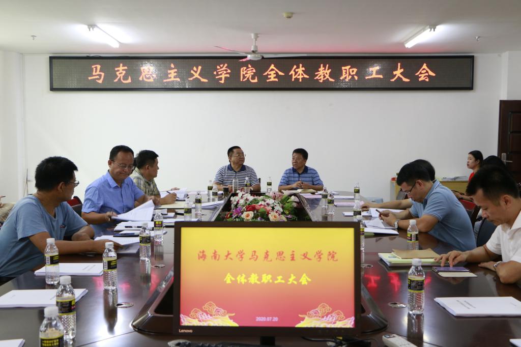 2020年7月20日下午,402永利集团官网入口在社科楼A-311召开全体教职工大会,院长张云阁、院党委书记段捷频、副院长杨娜、院党委副书记张井富、副院长王善、副院长秦晓华出席,全体教职工参加会议。院长张云阁主持会议。