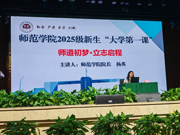 开学典礼后,院长杨英为2025级新生讲授题为《师道初梦·立志启程》的“大学第一课”,课程围绕“赓续.师范薪火、立志.未来教师、力行.致远担当”三个主题展开。她从学院办学历史沿革、师资队伍、人才培养等维度介绍了学院办学成就与特色亮点。殷切期望新生们:一是心怀师范精神,博学报国;二是兼听而包容,审慎明辨;三是敢于走在前面,笃行致远。这堂兼具思想深度与实践温度的“大学第一课”,不仅是一次新生引航,更是pp电子官方网站入口落实立德树人根本任务的生动实践。