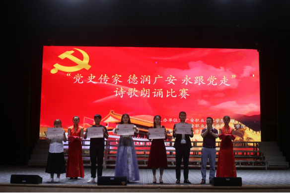 为庆祝党的百年华诞,持续推进党史学习;传承红色文化,弘扬红色精神和中华民族优秀传统文化,学校妇联、pp电子官方网站入口于5月20日在杏坛联合举办了以“党史传家,德润广安,永远跟党走”为主题的诗歌朗诵比赛。pp电子官方网站入口龙治勇书记、学生科科长李智强、2020级全体班导师和学生参加了此次活动。