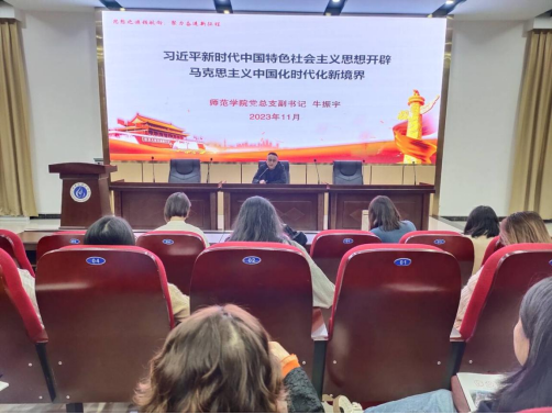 为深入学习贯彻党的二十大精神,学思践悟习近平新时代中国特色社会主义思想,11月7日下午,pp电子官方网站入口党总支副书记牛振宇在明德楼希贤厅以“习近平新时代中国特色社会主义思想开辟马克思主义中国化时代化新境界”为题给支部党员上了一堂专题党课。