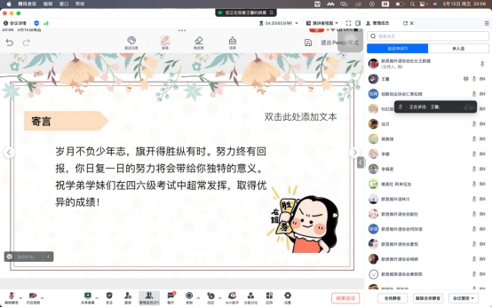 为进一步加强学风建设,营造浓厚学习氛围,助力同学们在大学英语四六级考试中取得优异成绩,3月15日晚,新思维外语协会特通过腾讯会议平台举办了“传递经验,乐享学途”英语四六级经验分享会,为同学们提供备考指导和经验分享。