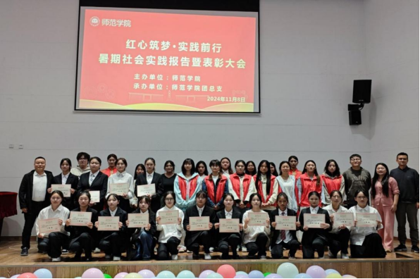 会上,实践团体以PPT讲解和视频展示的方式,生动地再现了暑期社会实践中的每一个精彩瞬间,从不同角度分享了他们的实践经验,充分展现暑假社会实践的累累硕果。随后,举行了活动表彰大会并为获奖个人及团队颁发荣誉证书并合影留念。最后,彭松林对2024年暑期社会实践活动的开展给予了高度评价,鼓励更多同学积极投身社会实践,牢记当代青年的责任与使命,以满腔热情汲取知识,以积极姿态投入实践,在奋斗中奏响辉煌的青春乐章。