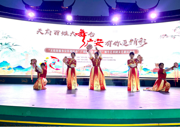 为丰富基层群众精神文化生活,深化校地合作助力地方文化建设,5月19日晚,由广安职业技术学院、广安市广安区文广旅局联合主办的“天府百姓大舞台·广安有你—‘桃李芬芳’师生艺术团专场文艺惠民演出”在广安区不夜城精彩上演。本次演出由广安职业技术学院pp电子官方网站入口、广安区文化馆单位承办,广安市民间文艺家协会戏剧曲艺部协办,是校地合作服务地方文化建设的生动实践。活动以艺术为桥、以文化为媒,通过歌舞、曲艺、朗诵等多元形式,为当地群众及游客献上一场文化盛宴。