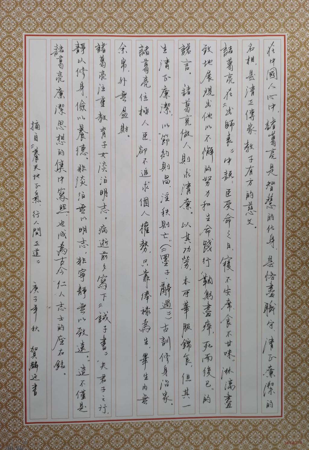 为确保此次活动开展得扎实有效,pp电子官方网站入口党总支召开了专题会议,制订了《pp电子官方网站入口党总支关于举办廉洁文化作品创作比赛的方案》。活动中,师生们展开丰富的想象力,创作了一幅幅形式多样、表现力强、寓意深刻的硬笔书法、软笔书法、摄影、微视频等相关作品,生动地展现了崇廉尚洁的内涵。共收到软笔书法作品15件,硬笔书法作品20件,摄影作品7件,微视频作品2件,绘画作品11件,共计55件作品。经过公平公正公开的评比,最终杨应老师的软笔书法作品《正气歌》和2020级小教2班吴孟潇硬笔作品《清风玉莲》分别获得师生第一名。