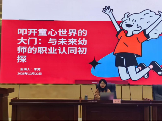 1222日晚,广安市第四幼儿园园长李芳应邀为学前教育专业2025级全体新生题为《叩开童心世界的大门:与未来幼师的职业认同初探》的专题讲座