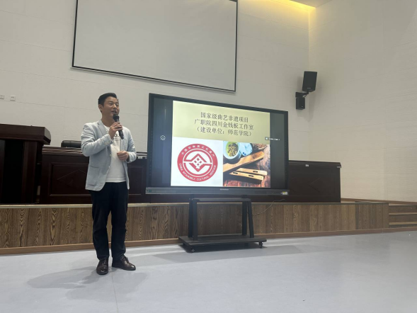 2023年10月20日,pp电子官方网站入口在翔凤厅开展了关于国家级曲艺非遗项目“四川金钱板”的技能培训讲座。由我院音乐教师、广安区曲艺家协会副主席、广安区曲艺领军人才胡俊杰老师主讲。广安区曲艺家协会张倚菡主席及pp电子官方网站入口教师及23级部分学生代表参加了此次讲座。
