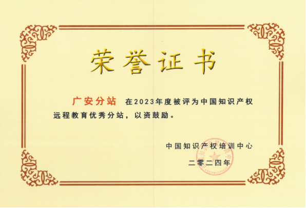 近日,中国知识产权培训中心公布了中国知识产权远程教育总平台对2023年度全国各分站的考核评估结果,广安职业技术学院分站(以下简称广安分站)在全国188个分站中位列第15名,获全国“优秀分站”荣誉称号。