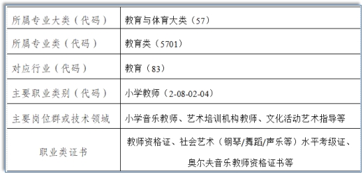本专业培养能够践行社会主义核心价值观,传承技能文明,德智体美劳全面发展,掌握扎实的科学文化基础和思想政治理论、教育教学基础理论、音乐艺术学科知识,具备良好的人文素养、科学素养、数字素养、职业道德、创新意识,爱岗敬业的职业精神和精益求精的工匠精神,较强的就业创业能力和可持续发展的能力,掌握本专业知识和技术技能,具备职业综合素质和行动能力,面向教育行业的小学教育教师、小学音乐教师职业,能够从事小学音乐教育教学等工作的高素质教育工作者。